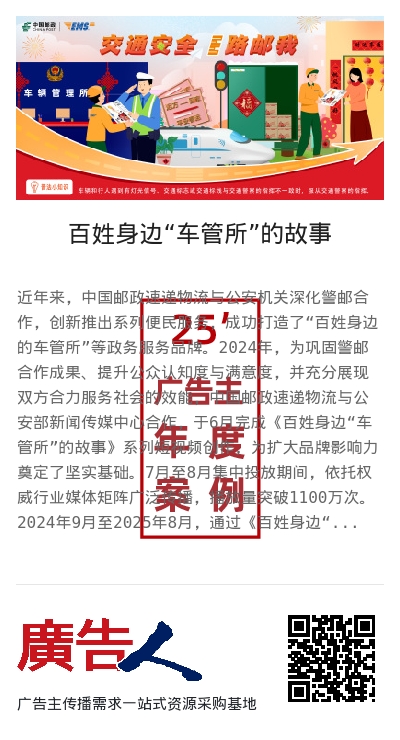 近年来,中国邮政速递物流与公安机关深化警邮合作,创新推出系列便民服务,成功打造了“百姓身边的车管所”等政务服务品牌。2024年,为巩固警邮合作成果、提升公众认知度与满意度,并充分展现双方合力服务社会的效能,中国邮政速递物流与公安部新闻传媒中心合作,于6月完成《百姓身边“车管所”的故事》系列短视频创作,为扩大品牌影响力奠定了坚实基础。7月至8月集中投放期间,依托权威行业媒体矩阵广泛传播,播放量突破1100万次。
