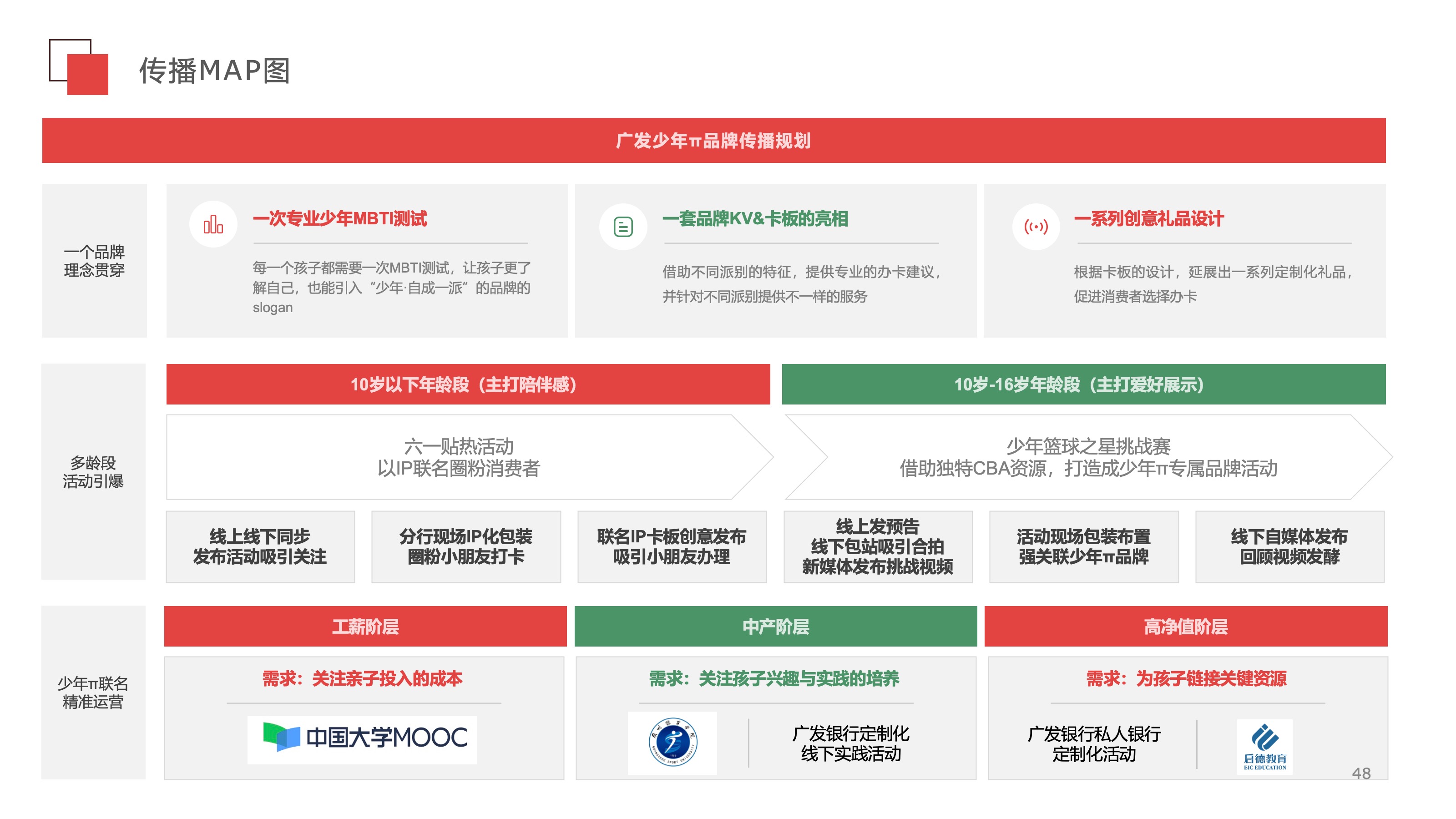 一、品牌目标:建立“少年π”差异化品牌认知,成为亲子金融领导品牌,提升品牌声量提升,打造行业标杆案例;二、用户目标:触达30万+目标家庭,转化率达10%,客户满意度超90%,建立长期用户粘性。通过创新人格派系和IP生态,实现从获客到留存的全链路优化,将广发银行打造为最懂孩子、最受家长信赖的亲子金融首选品牌。