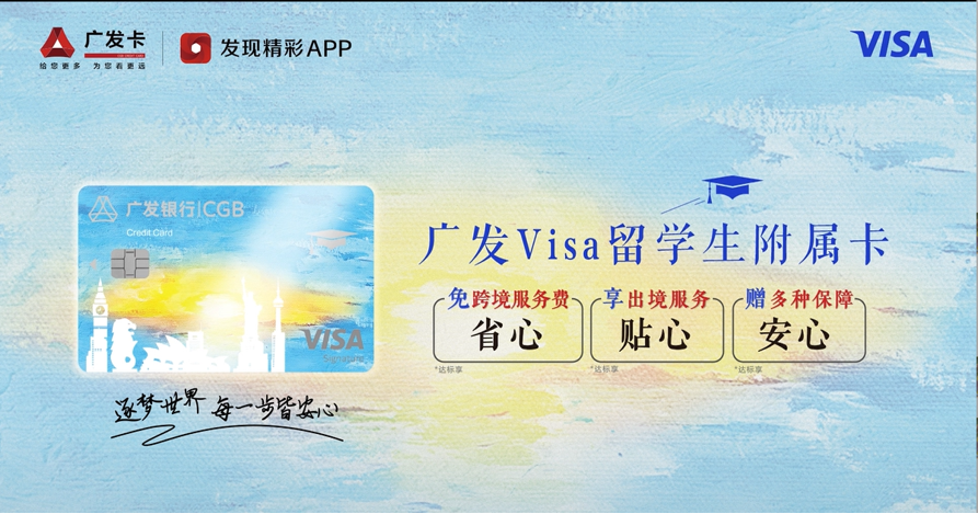 广发银行Visa留学生附属卡以“广发留学通,留学更安心”为核心主张,致力于为海外学子提供全方位金融保障与情感支持。品牌倡导“勇敢追梦,安心相伴”,通过金融产品传递安全感与信任感,助力留学生在探索世界的过程中无后顾之忧,专注成长与体验。
