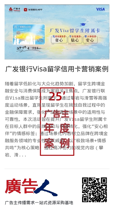 以“极致场景+情感共鸣”为核心策略,通过高冲击力的视觉内容(攀岩、滑雪)凸显产品在高风险环境下的“安心”属性。紧扣留学生及其家庭的情感痛点,将金融功能转化为情感价值,建立“广发留学通=留学保障”的认知关联,驱动决策。
