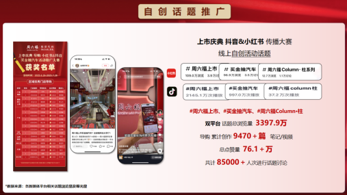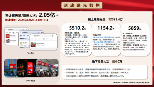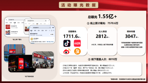 该活动累计曝光超2.05亿人次,线上话题及媒体宣发达12523.4万,线下广告覆盖8010万。抖音、小红书话题总浏览3397.9万,导购创作超9470篇内容,获76.1万+点赞、8.5万+人次讨论,热搜等热度亮眼,营销传播与用户参与效果显著。