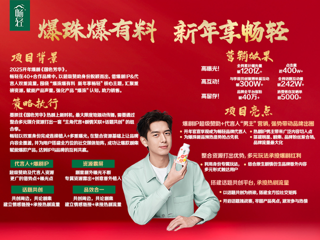 在40+合作品牌中,畅轻以超级赞助身份脱颖而出,借爆剧IP&代言人双重流量,围绕“爆珠爆有料 新年享畅轻”核心主题,汇聚重磅资源,赋能产品声量,强化产品“爆珠”认知,助力销售
