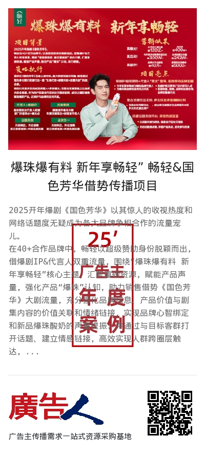 借势《国色芳华》IP价值,畅轻围绕“爆珠爆有料 新年享畅轻”核心主题,以“硬广曝光+创意内容”为投放策略,并组合微博、抖音、小红书等社交媒体矩阵,以爆款剧集赋能爆款产品。
