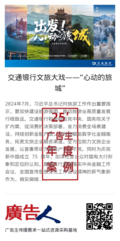 2024年7月,习近平总书记对旅游工作作出重要指示,要加快建设旅游强国,推动旅游业高质量发展行稳致远。交通银行积极响应党中央、国务院关于扩内需、促消费的决策部署,发力消费全场景建设,持续创新金融产品,以科技赋能数字化金融服务,拓宽文旅企业融资渠道,全方位助力文旅企业发展,以普惠带动万家商户让利于民。同时为庆祝新中国成立 75 周年,加深社会公众对国有大行形象和定位的认知,展现交行贯彻落实中央金融工作会议、全国宣传思想文化工作会议精神的新气象新作为,做实做细“五篇大文章”,交行以金融支持文旅产业高质量发展为切口,整合权威媒体与客户服务优势资源,开展系列文旅主题宣传。