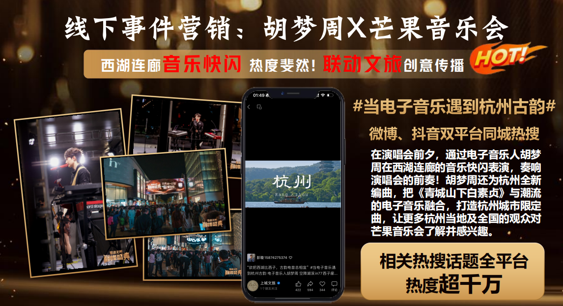 2. 事件营销:联动电子音乐人胡梦周在西湖连廊举办音乐快闪,将《青城山下白素贞》改编为电子曲,打造“当电子音乐遇到杭州古韵”爆款话题;发起线上“粉丝告白企划”,演唱会现场联动线下粉丝应援,强化情感连接。