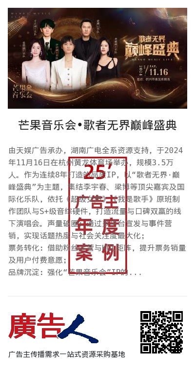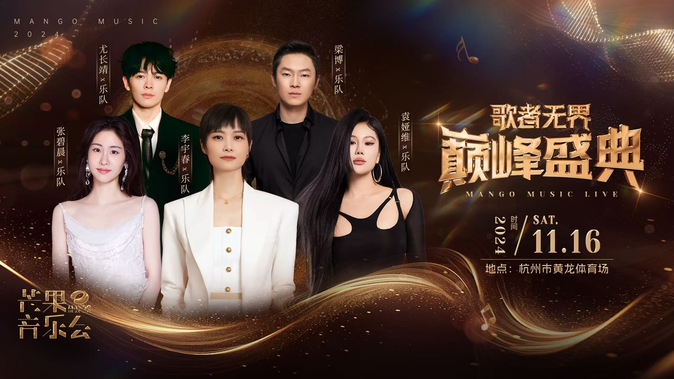 由天娱广告承办,湖南广电全系资源支持,于2024年11月16日在杭州黄龙体育场举办,规模3.5万人。作为连续8年打造的品质IP,以“歌者无界·巅峰盛典”为主题,集结李宇春、梁博等顶尖嘉宾及国际化乐队,依托《超级女声》《我是歌手》原班制作团队与S+级音综硬件,打造流量与口碑双赢的线下演唱会。