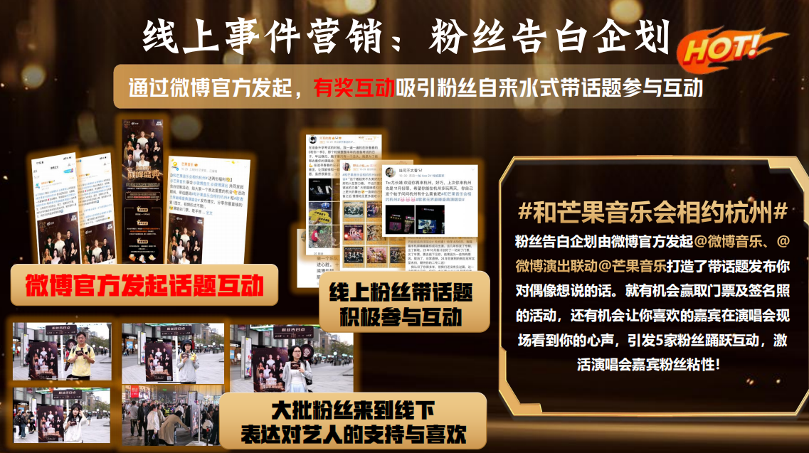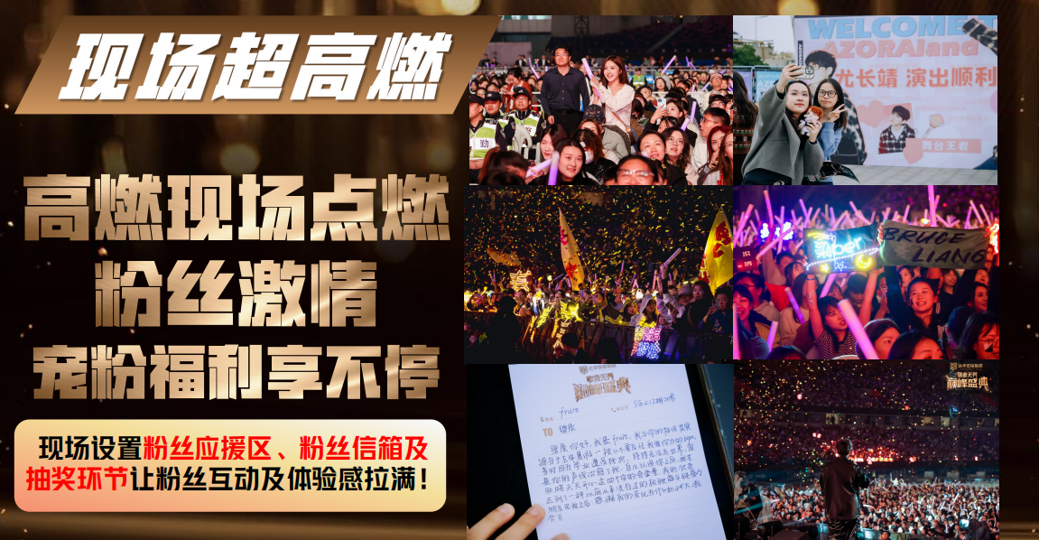 2. 现场互动:设置粉丝应援区、粉丝信箱及抽奖环节;组织五家粉丝超话及私域运营,开展粉丝团票,拉动票务销售。