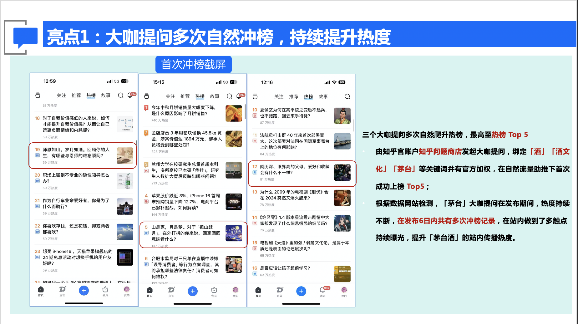 2.大咖提问多次自然冲榜,最高进入热榜Top 5,覆盖「酒」「酒文化」「茅台」等高关联话题。发布6天内持续登榜,实现多轮曝光,显著提升品牌在站内的讨论热度。