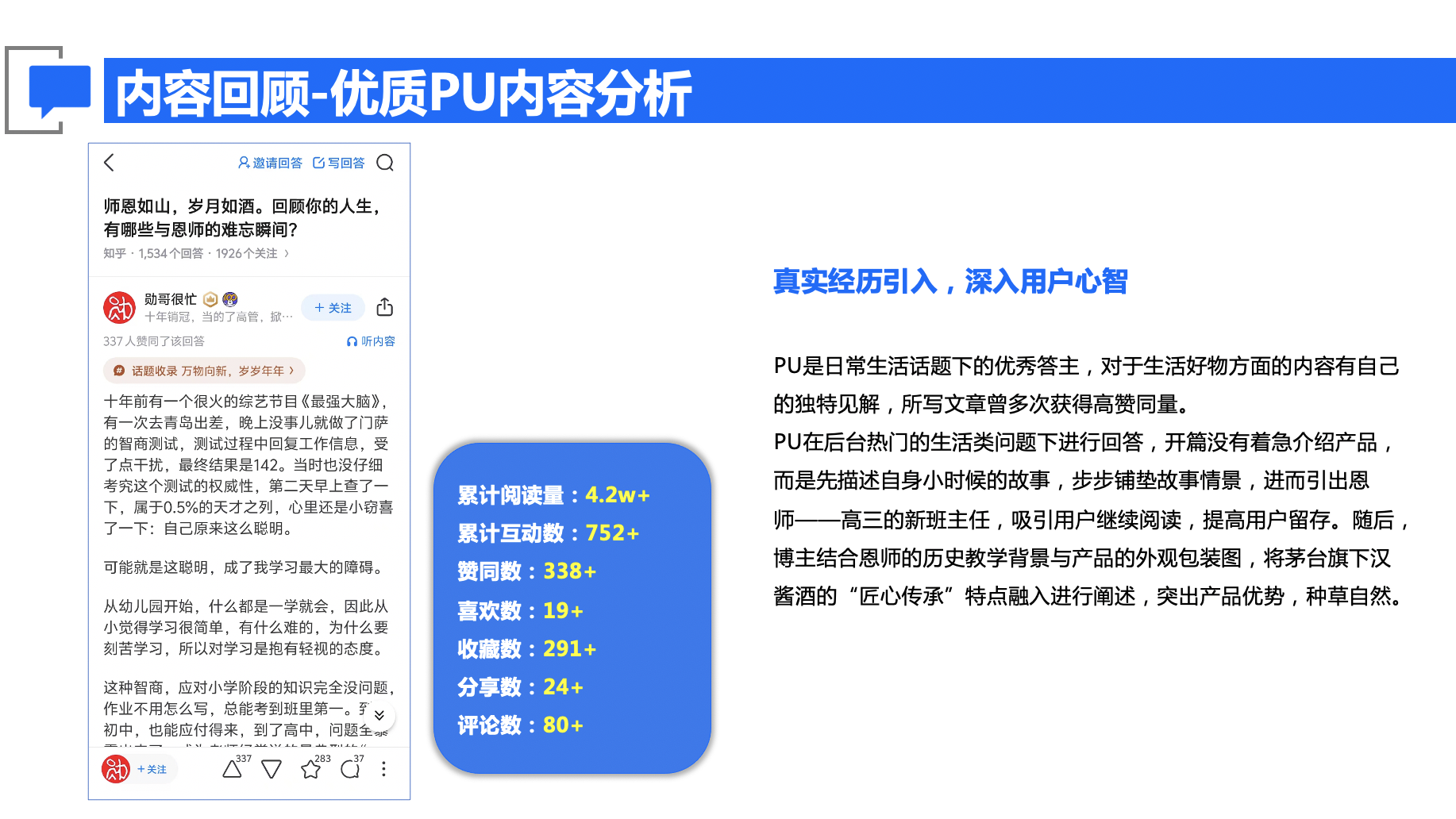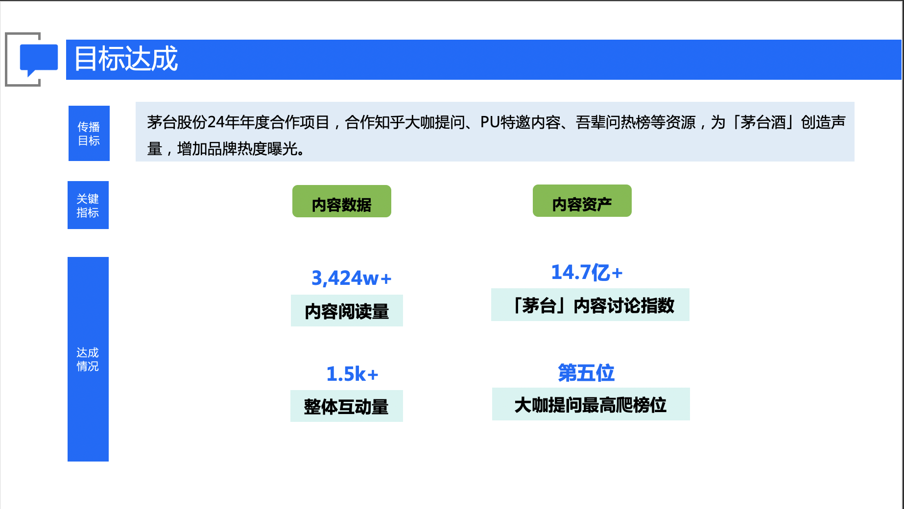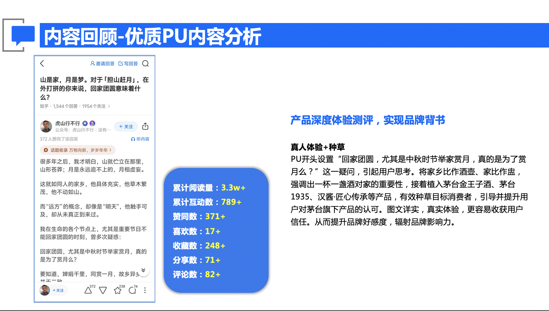 项目以提升茅台品牌在知乎场域的美誉度与心智占有为核心目标,具体致力于:实现品牌声量的显著提升;借助情感化、场景化内容深化用户对茅台品牌文化与社会价值的认同;并通过精准沟通促进目标人群资产的有效沉淀与品牌忠诚度的强化。