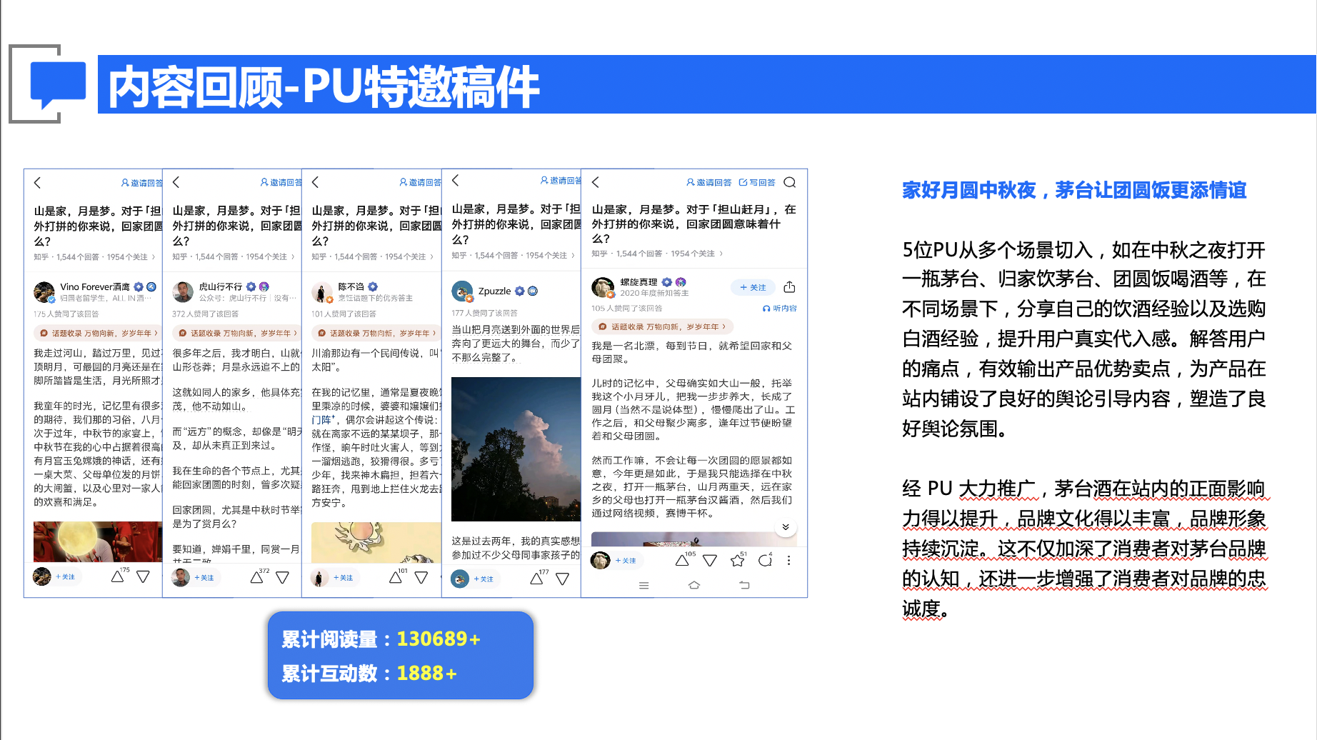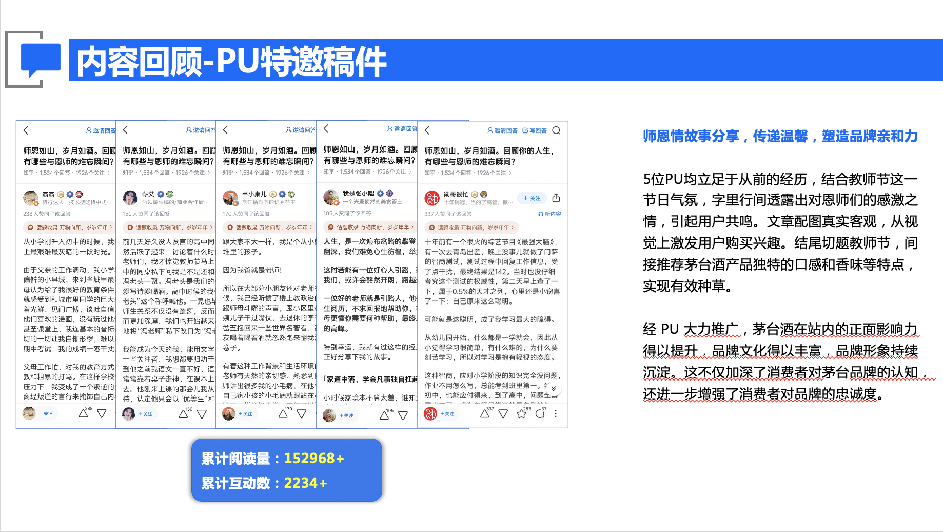 项目以「节日情感」为贯穿主线,紧密围绕教师节、中秋节及「国之栋梁」公益项目、年底等节点,通过「大咖提问引爆话题+优质PU内容深度共鸣」的组合策略,将茅台品牌形象自然融入用户的情感记忆与家国情怀中,实现品牌价值从「产品层面」到「文化情感层面」的升华。