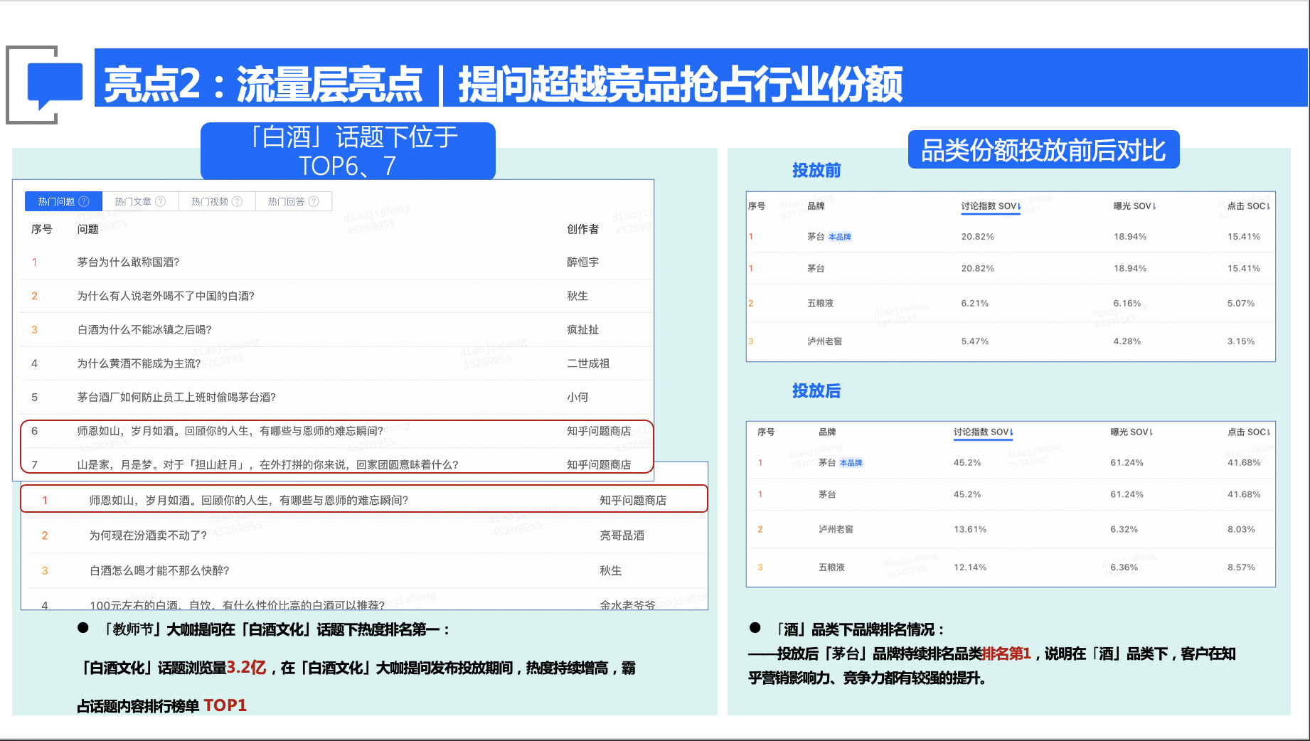 1.实现品牌声量与认知的答复提升,「茅台」内容讨论指数达14.7亿;「白酒文化」话题浏览量达3.2亿,占据该话题内容排行榜TOP1,带动「白酒」品类整体讨论指数提升37.94%。