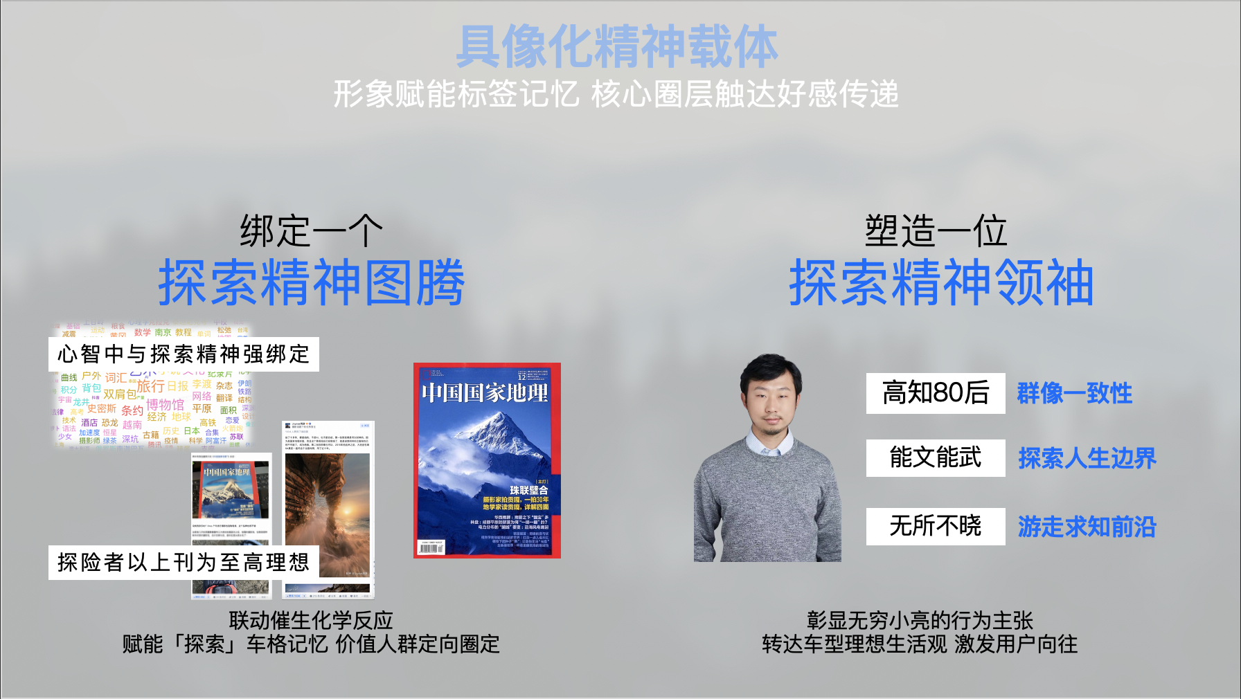 我们采取「场景占位、价值升维、信任背书」三重策略。首先,切入「轻户外」蓝海场景,定义「山系SUV」新品类,实现错位竞争。其次,提炼「探索的人先享受世界」核心价值主张,将产品力升华为精神共鸣。最关键的是,联名权威IP「国家地理」并签约顶级KOL「无穷小亮」为精神领袖,以「权威机构+顶流专家」的顶级信任状,为品牌格调与焕新产品力双重背书,实现品牌价值的破圈。