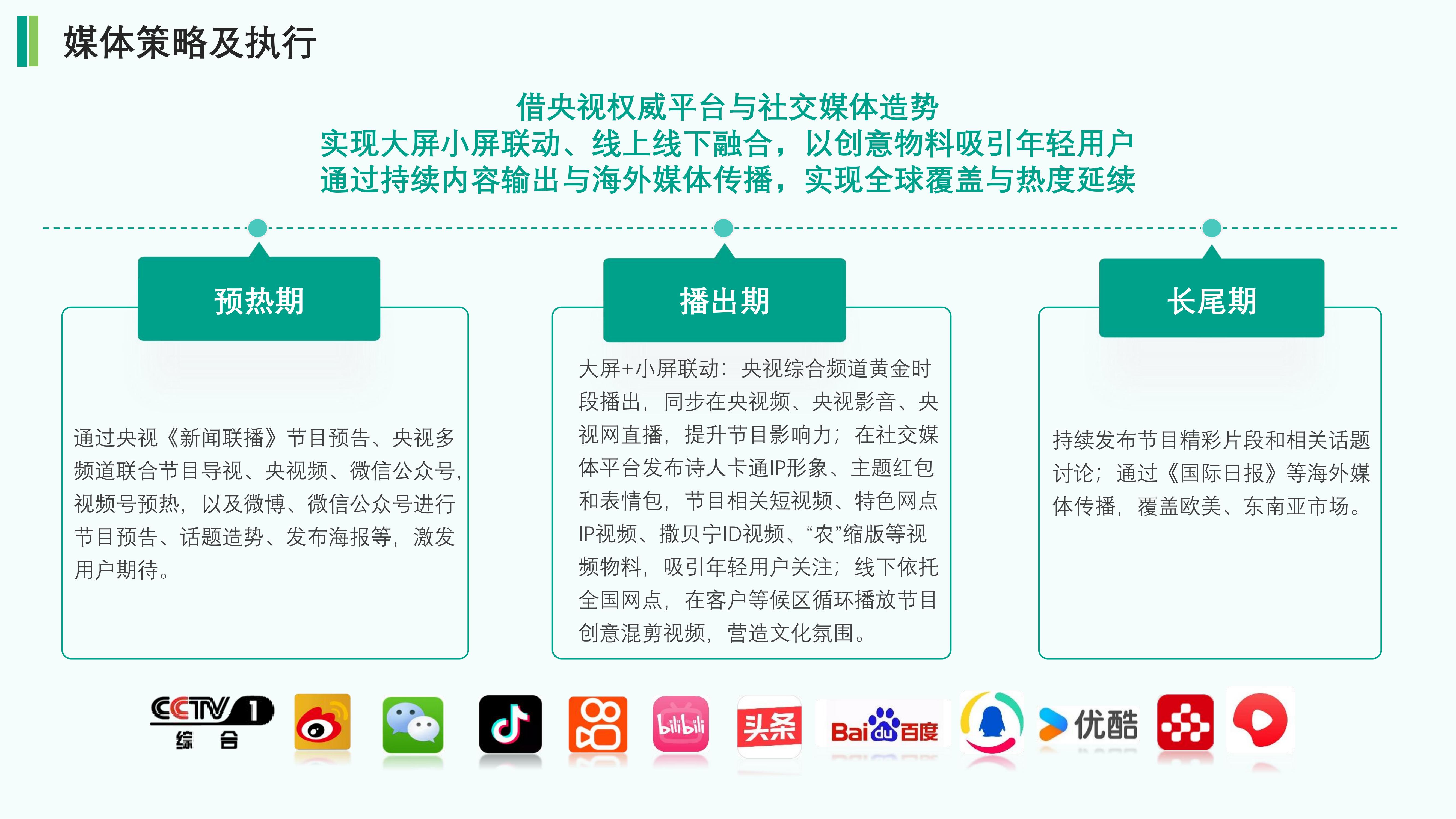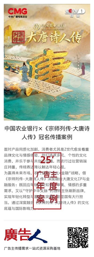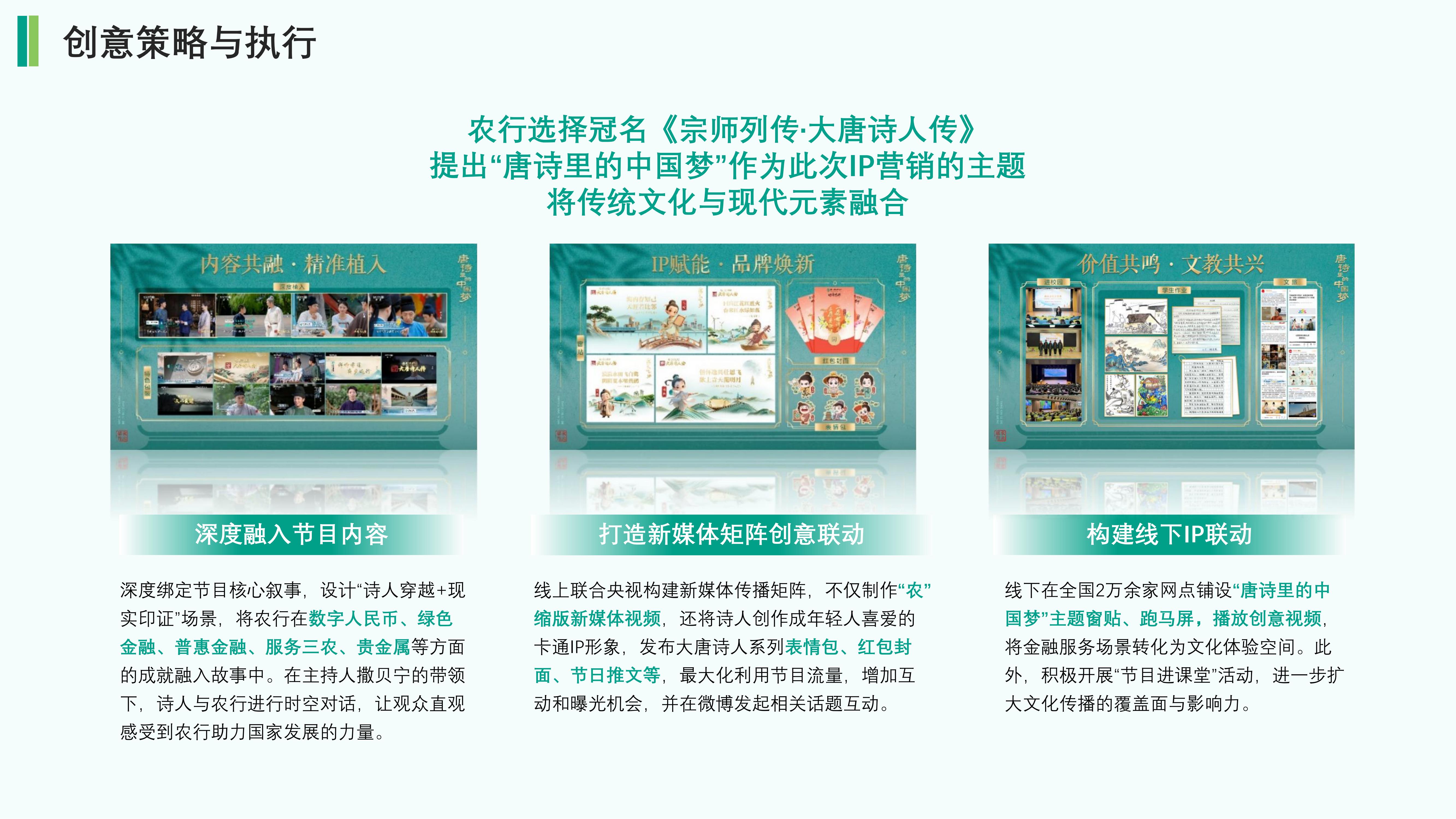 中国农业银行以“唐诗里的中国梦”为IP营销主题,联合央视顶级文化节目《宗师列传·大唐诗人传》,深耕大唐“顶流诗人”与千古名篇,借中华优秀传统文化回归契机,实现Z世代喜闻乐见的大唐文化IP与农行品牌的深度融合,让年轻用户理解农行品牌使命,助力品牌形象焕新。