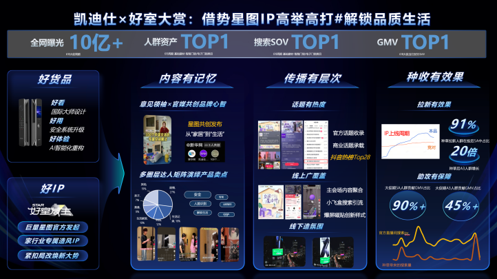 借势星图、小红书IP高举高打#解锁品质生活 ,联合官媒x意见领袖共创有记忆内容,话题有层次,冲上热榜Top28,新华网发文好评,线上线上全覆盖,品类SOV升至第一,人群资产拉新2亿,大促期A3人群贡献45%+,销售提升106%;