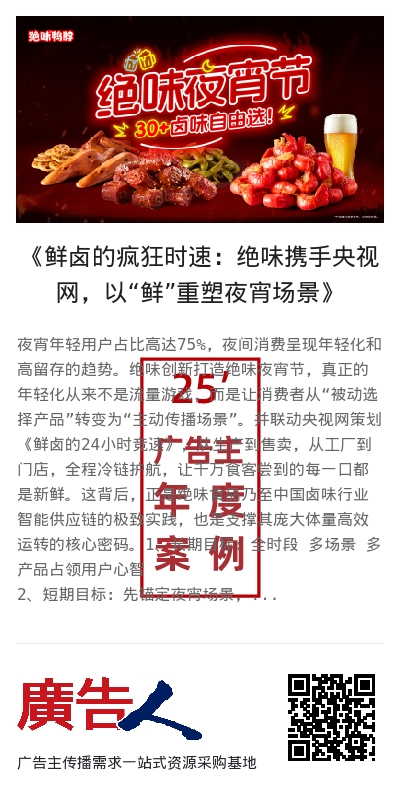 夜宵年轻用户占比高达75%,夜间消费呈现年轻化和高留存的趋势。绝味创新打造绝味夜宵节,真正的年轻化从来不是流量游戏,而是让消费者从“被动选择产品”转变为“主动传播场景”。并联动央视网策划《鲜卤的24小时竞速》,从生产到售卖,从工厂到门店,全程冷链护航,让千万食客尝到的每一口都是新鲜。这背后,正是绝味食品乃至中国卤味行业智能供应链的极致实践,也是支撑其庞大体量高效运转的核心密码。
