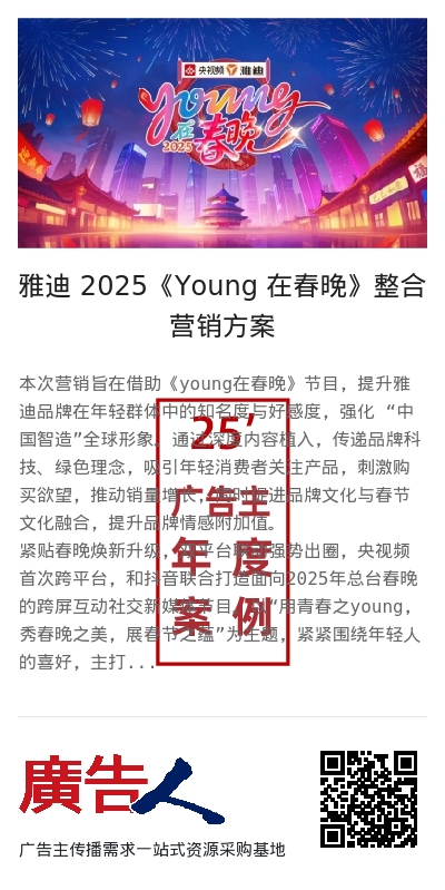 本次营销旨在借助《young在春晚》节目,提升雅迪品牌在年轻群体中的知名度与好感度,强化 “中国智造”全球形象。通过深度内容植入,传递品牌科技、绿色理念,吸引年轻消费者关注产品,刺激购买欲望,推动销量增长,同时促进品牌文化与春节文化融合,提升品牌情感附加值。