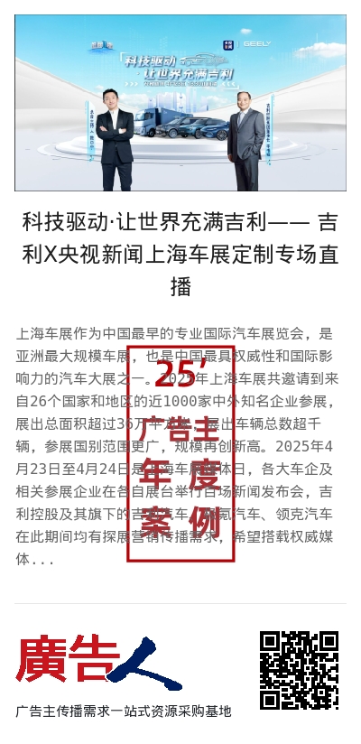 2025年4月23日至4月24日是上海车展媒体日,各大车企及相关参展企业在各自展台举行百场新闻发布会,吉利控股及其旗下的吉利汽车、极氪汽车、领克汽车在此期间均有探展营销传播需求,希望搭载权威媒体进行新车的发布、颠覆性创新技术的解读,借此提升品牌的曝光度。