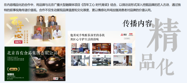首农食品集团联合北京广播电视台,助力品牌实现转型与价值提升。①高频声量传播,强化品牌日常认知:锁定北京广播王牌栏目及早晚高峰黄金点位,强化首农品质形象。②精品内容创作,传递文化与情感价值:融入多主题IP资源,通过独特叙事传递品牌价值观,增强消费者对老字号的情感认同与文化共鸣。③线上线下联动,实现声量到消费转化:整合线下IP活动,设置首农小食、华都食品等产品展陈与体验区,助力品牌从声量到转化的闭环。