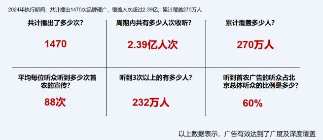 执行期间,共计播出1470次品牌广告,覆盖人次超过2.39亿,累计覆盖270万人,平均每位听众听到有关首农的宣传达到88次。项目显著提升了“首农”母品牌及旗下老字号子品牌的认知度,成功传递了“品质安心”的品牌核心价值。通过持续的品牌露出和品质承诺传播,首农品牌价值不断攀升,连续十年荣获“中国最具价值品牌”称号,有效实现了品牌价值与市场影响力的双重提升。