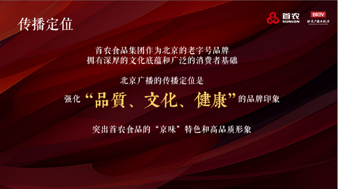 首农食品集团作为承载 13 个中华老字号与 19 个北京老字号的重要国有食品企业,正处于从“产品销售”向“品牌塑造”战略转型的关键阶段,亟需提升品牌现代形象与文化引领力。而北京广播作为首都权威媒体平台,拥有广泛受众覆盖和深厚文化传播底蕴,双方基于“弘扬国潮、守护京味”的共同使命达成合作。该项目致力于提升品牌声量,更强调文化价值与消费者信任的双向传递,助力首农实现从“产品供应商”到“生活方式倡导者”的战略升级。