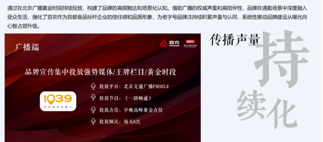 围绕“传播声量持续化、内容制作精品化、传播方式多样化”三大策略,为首农提供立体化品牌传播服务:1、声量持续化:通过黄金时段高频次露出,强化“首农”品牌与北京市民日常生活的深度关联。2、内容精品化:以品牌故事为主线,结合热点、城市记忆、健康饮食等话题,打造系列音频故事专题,实现情感共鸣与文化传承的双向赋能。3、方式多样化:整合北京广播台内大型品牌活动资源,增强消费者对品牌的直观体验与信任感。