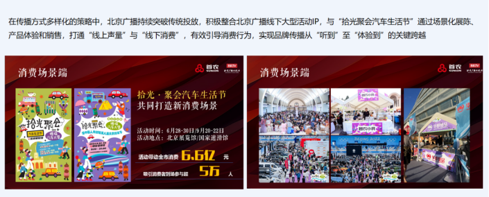 北京广播电视台从渠道精准选择、场景深度绑定、内容多端分发、线上线下联动四大维度,制定系统化媒体策略,实现品牌声量、认知与价值的三重提升。在渠道选择上,聚焦北京广播黄金档王牌栏目《一路畅通》,覆盖重点人群,精准匹配首农“深耕北京市场”的需求,并以 “陪伴式传播” 为传播策略。同时结合台内IP资源打造定制化内容,如线上的《北京老字号传奇》系列短视频、《百年工心 时代脊梁》微访谈,线下的“拾光聚会汽车生活节”等。