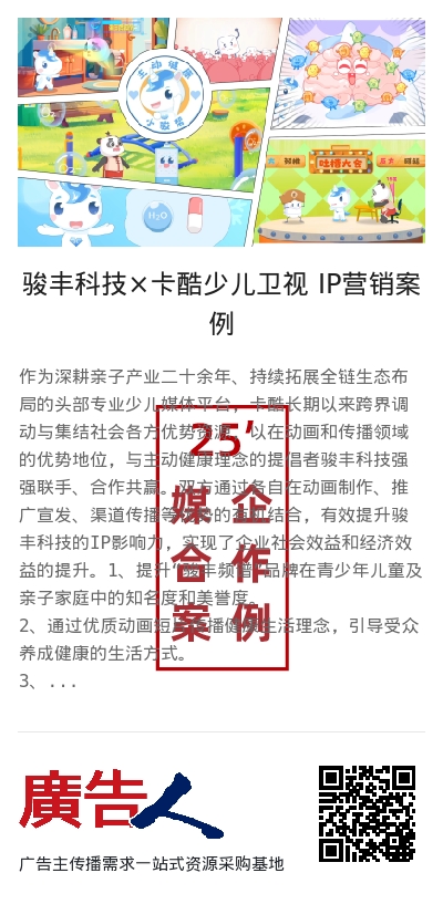 作为深耕亲子产业二十余年、持续拓展全链生态布局的头部专业少儿媒体平台,卡酷长期以来跨界调动与集结社会各方优势资源,以在动画和传播领域的优势地位,与主动健康理念的提倡者骏丰科技强强联手、合作共赢。双方通过各自在动画制作、推广宣发、渠道传播等优势的有机结合,有效提升骏丰科技的IP影响力,实现了企业社会效益和经济效益的提升。