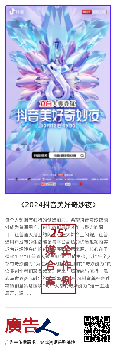 2024抖音美好奇妙夜在媒体策略上采取了多平台同步直播、线上线下深度互动、深度融合抖音生态内容、明星与KOL联动效应等策略,旨在最大限度地扩大活动影响力,并强化抖音平台"让普通人被看见"的价值主张。