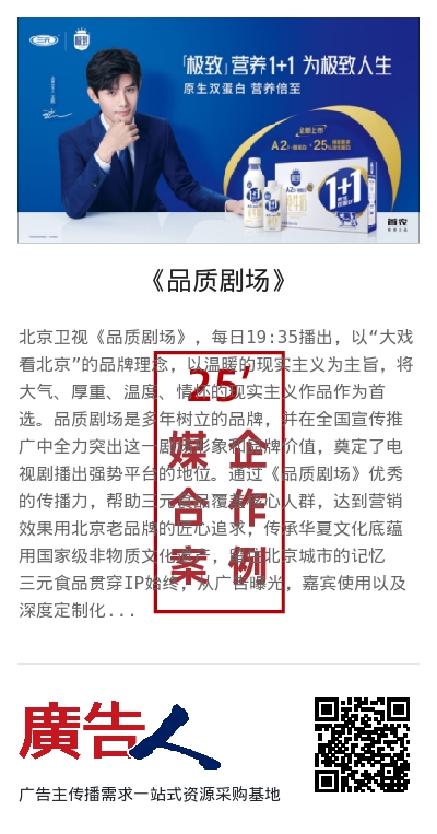 北京卫视《品质剧场》,每日19:35播出,以“大戏看北京”的品牌理念,以温暖的现实主义为主旨,将大气、厚重、温度、情怀的现实主义作品作为首选。品质剧场是多年树立的品牌,并在全国宣传推广中全力突出这一剧场形象和品牌价值,奠定了电视剧播出强势平台的地位。