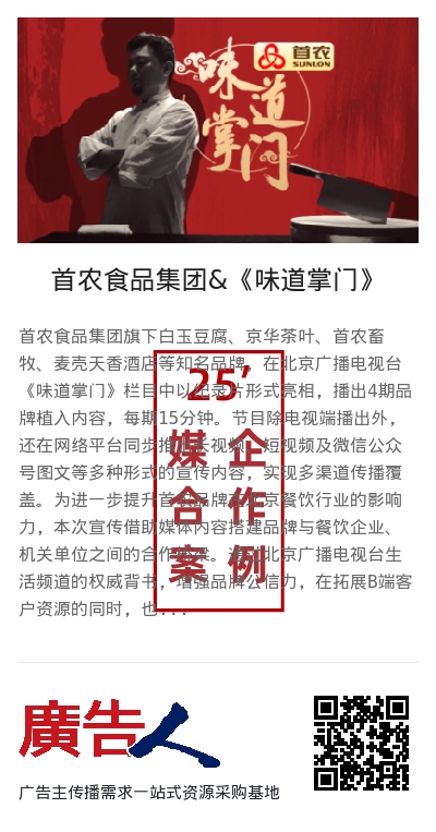 首农食品集团旗下白玉豆腐、京华茶叶、首农畜牧、麦壳天香酒店等知名品牌,在北京广播电视台《味道掌门》栏目中以纪录片形式亮相,播出4期品牌植入内容,每期15分钟。节目除电视端播出外,还在网络平台同步推出长视频、短视频及微信公众号图文等多种形式的宣传内容,实现多渠道传播覆盖。