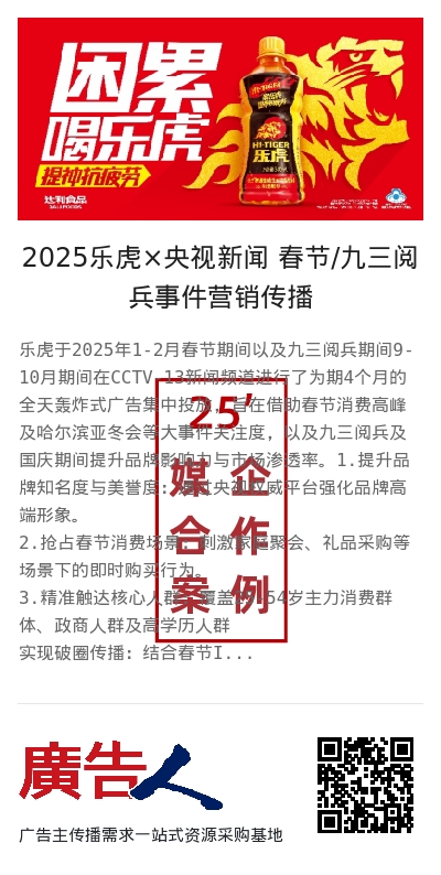 乐虎于2025年1-2月春节期间以及九三阅兵期间9-10月期间在CCTV-13新闻频道进行了为期4个月的全天轰炸式广告集中投放,旨在借助春节消费高峰及哈尔滨亚冬会等大事件关注度,以及九三阅兵及国庆期间提升品牌影响力与市场渗透率。