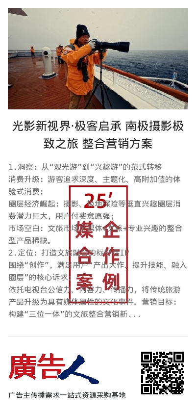 发挥BRTV强大的背书与宣推效能,覆盖首都,辐射全域,提升品牌曝光度与知名度。以“旅游+兴趣+培训”的模式,借南极之旅帮助C端受众完成他们的“人生清单”,为品牌细分出具有良好经济基础、热衷于兴趣消费、愿意为爱好买单的高消费力人群。通过旅程途中多种形式的商品露出、品牌信息植入,让品牌与产品同消费潜力巨大的潜在受众零距离接触,在品牌与消费者之间建立强联系。