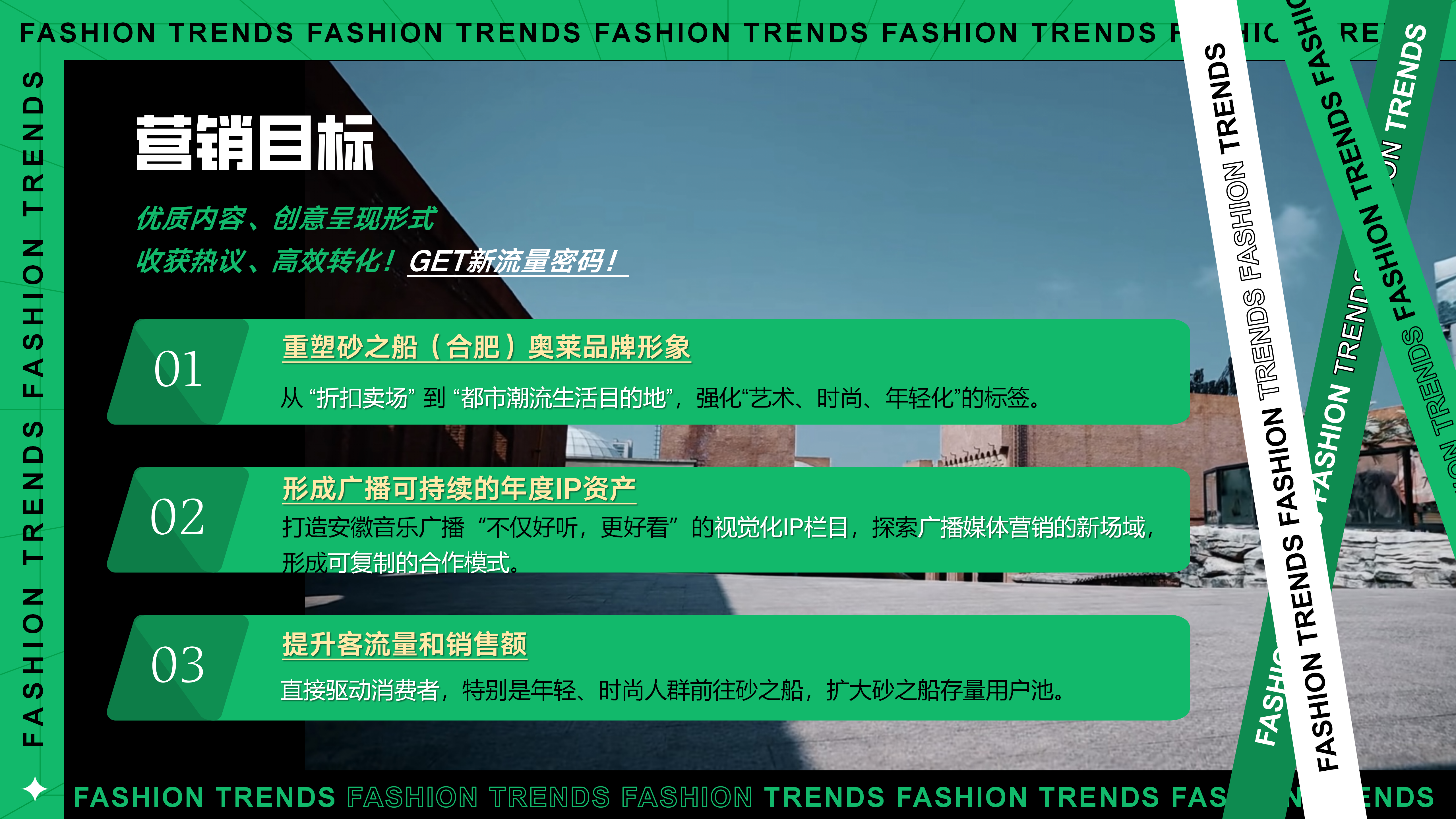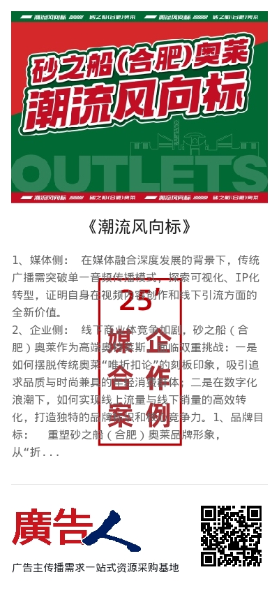 1、品牌目标: 重塑砂之船(合肥)奥莱品牌形象,从“折扣卖场”升级为“都市潮流生活目的地”,强化“艺术、时尚、年轻化”的标签。