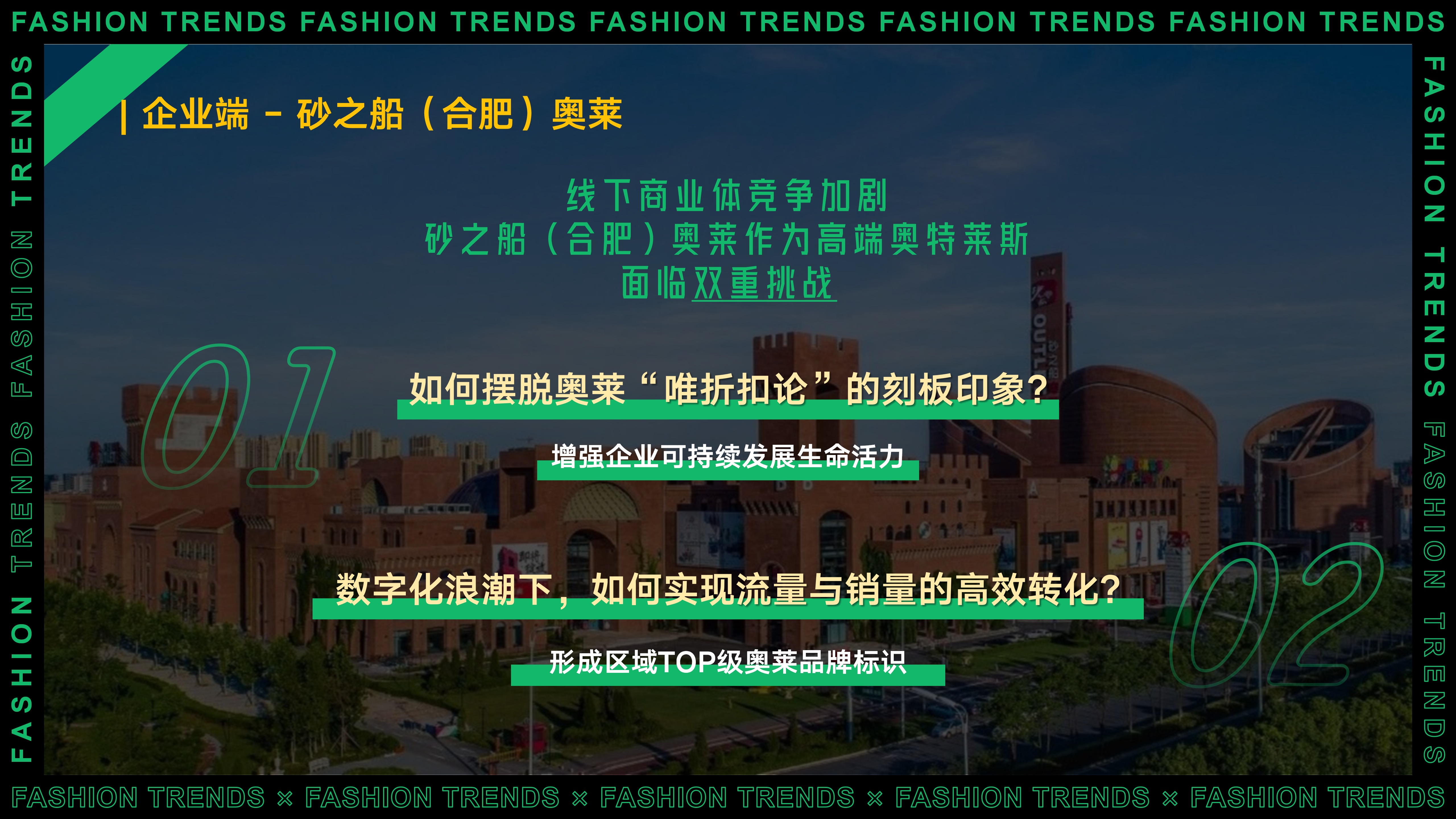 2、企业侧: 线下商业体竞争加剧,砂之船(合肥)奥莱作为高端奥特莱斯,面临双重挑战:一是如何摆脱传统奥莱“唯折扣论”的刻板印象,吸引追求品质与时尚兼具的年轻消费群体;二是在数字化浪潮下,如何实现线上流量与线下销量的高效转化,打造独特的品牌标识和核心竞争力。