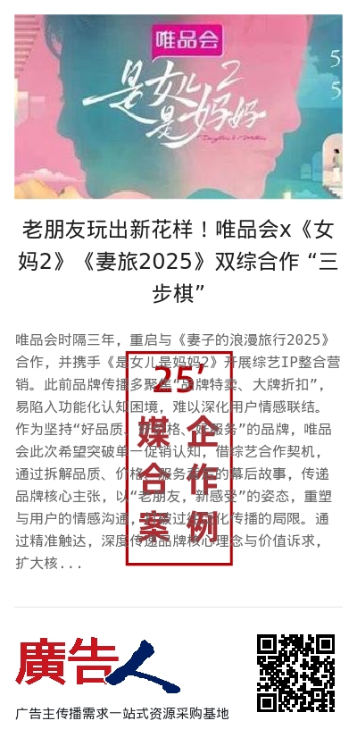 唯品会时隔三年,重启与《妻子的浪漫旅行2025》合作,并携手《是女儿是妈妈2》开展综艺IP整合营销。此前品牌传播多聚焦“品牌特卖、大牌折扣”,易陷入功能化认知困境,难以深化用户情感联结。作为坚持“好品质、好价格、好服务”的品牌,唯品会此次希望突破单一促销认知,借综艺合作契机,通过拆解品质、价格、服务背后的幕后故事,传递品牌核心主张,以“老朋友,新感受”的姿态,重塑与用户的情感沟通,打破过往泛化传播的局限。