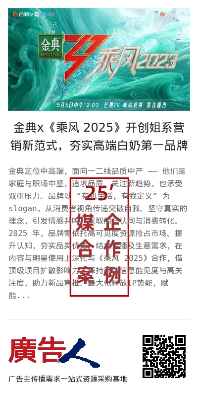 金典定位中高端,面向一二线品质中产 —— 他们是家庭与职场中坚,追求品质、关注新趋势,也承受双重压力。品牌以 “有机生活,有我定义” 为 slogan,从消费者视角传递突破自我、坚守真实的理念,引发情感共鸣,获取用户认同与消费转化。2025 年,品牌需依托高可见度资源抢占市场、提升认知,夯实品类优势。结合传播及生意需求,在内容与明星使用上深化与《乘风 2025》合作,借顶级项目扩散影响力,保持品牌信息能见度与高关注度,助力新品宣推。