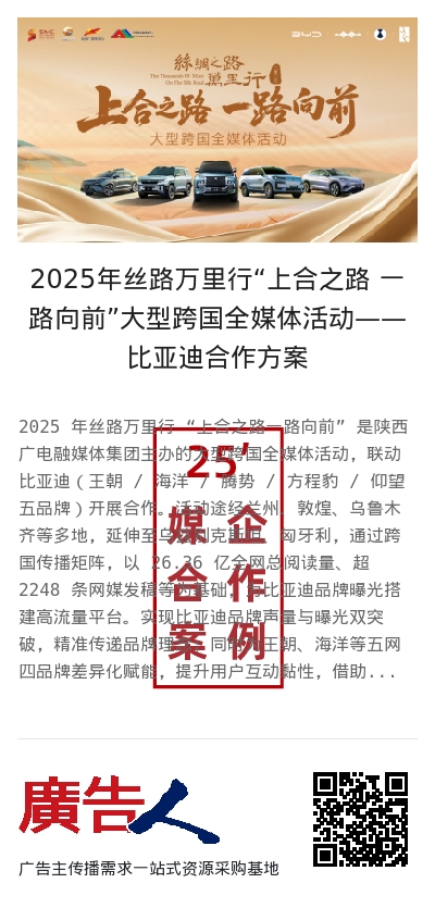 2025 年丝路万里行 “上合之路一路向前” 是陕西广电融媒体集团主办的大型跨国全媒体活动,联动比亚迪(王朝 / 海洋 / 腾势 / 方程豹 / 仰望五品牌)开展合作。活动途经兰州、敦煌、乌鲁木齐等多地,延伸至乌兹别克斯坦、匈牙利,通过跨国传播矩阵,以 26.36 亿全网总阅读量、超 2248 条网媒发稿等为基础,为比亚迪品牌曝光搭建高流量平台。