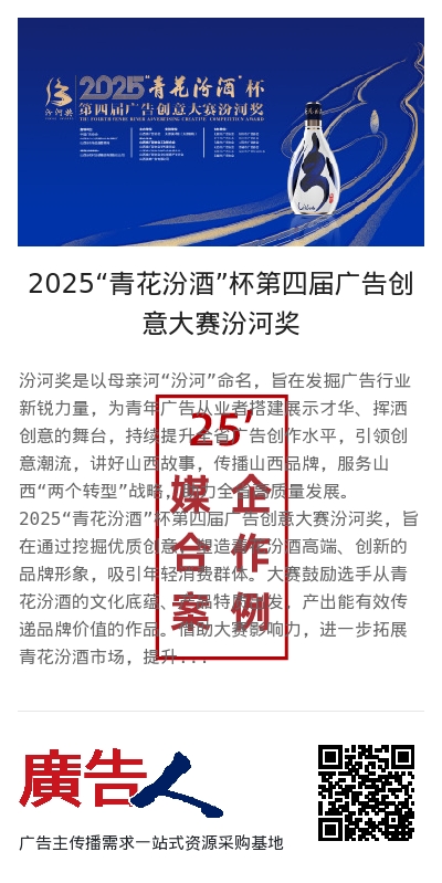 2025“青花汾酒”杯第四届广告创意大赛汾河奖,旨在通过挖掘优质创意,塑造青花汾酒高端、创新的品牌形象,吸引年轻消费群体。大赛鼓励选手从青花汾酒的文化底蕴、产品特质出发,产出能有效传递品牌价值的作品。借助大赛影响力,进一步拓展青花汾酒市场,提升市场份额,助力汾酒在2025 - 2030年复兴纲领第二阶段实现全要素高质量发展 ,扎根中国酒业第一方阵。