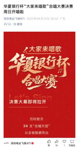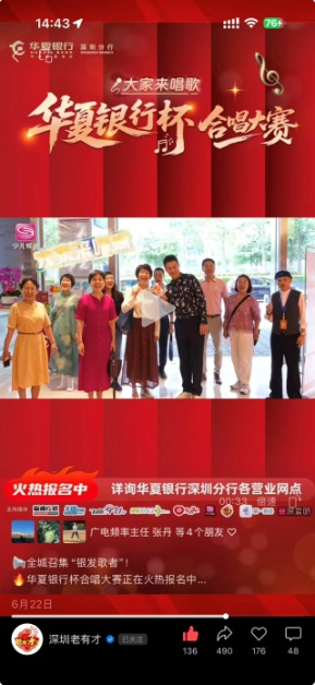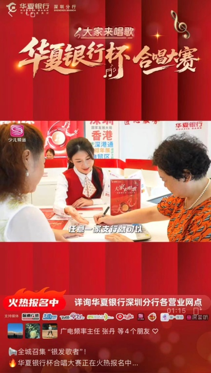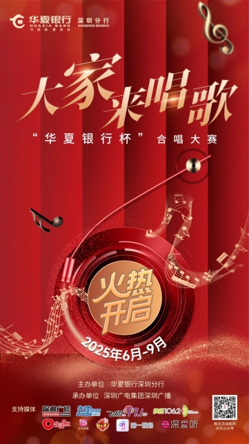 2025年5月,华夏银行深圳分行主办、深圳广电集团深圳广播承办的华夏银行杯“大家来唱歌”合唱大赛正式启动并开启报名。大赛以服务深圳地区45岁以上的中老年市民为核心,通过文化艺术纽带,打造“金融服务+乐龄文化”融合新场景,为养老金融注入人文温度。